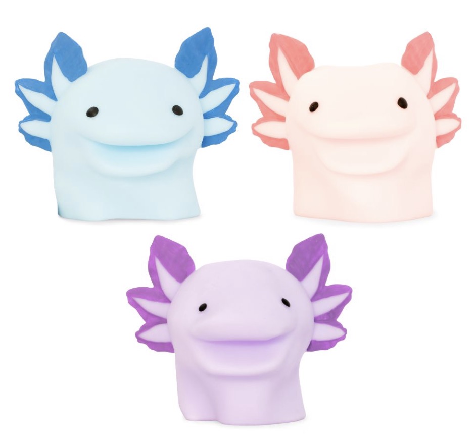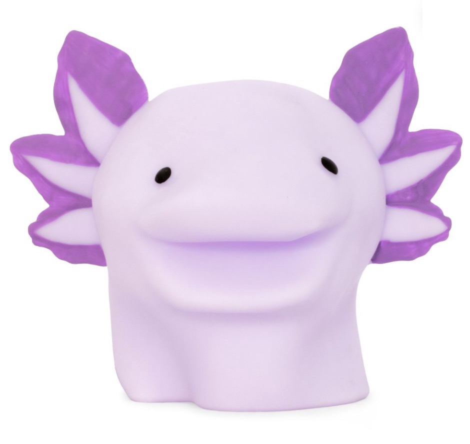 This playful axolotl hand puppet is available in three vibrant colours- purple, blue and pink. Made from soft, non-toxic rubber, it is safe for all ages. Perfect for imaginative play, these axolotl puppets can be used for storytelling and ventriloquism, as the mouth can be moved with your hand.