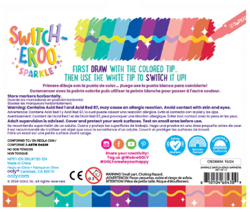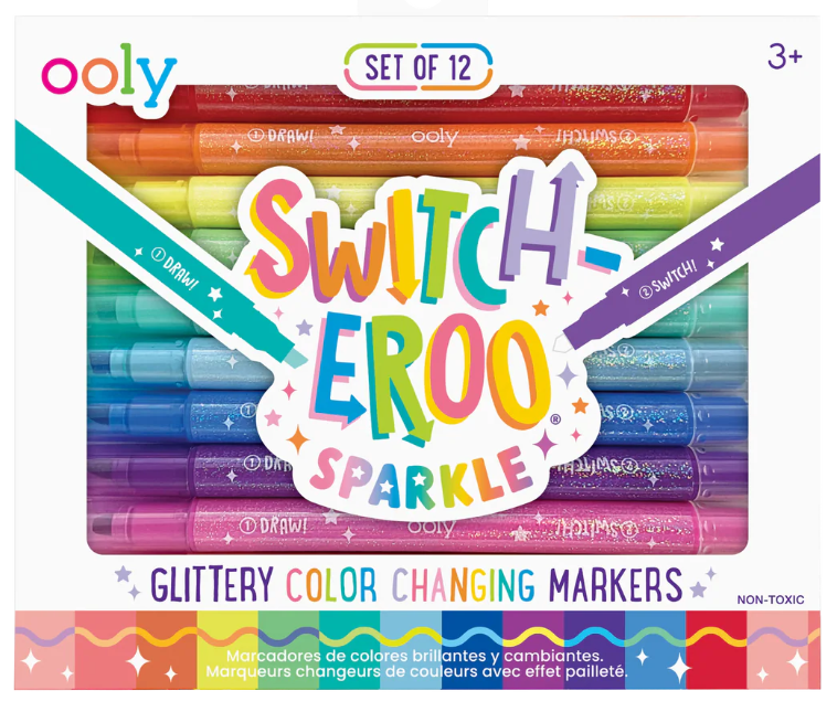 Add some sparkle to your creations with the Switch-Eroo Sparkle Glittery Color Changing Markers! This set of 12 color changing markers combines vibrant glittery hues with an exciting surprise—each marker is double-ended, featuring a dazzling glittery color on one side and a surprise mystery color on the other. Use the glitter side to add shimmer and shine, then flip the marker to reveal a secret shade to totally switch up the shade and switch up your design. These glitter markers are ready for all your creative endeavors – decorating cards, personalizing notebooks, or making school projects stand out.