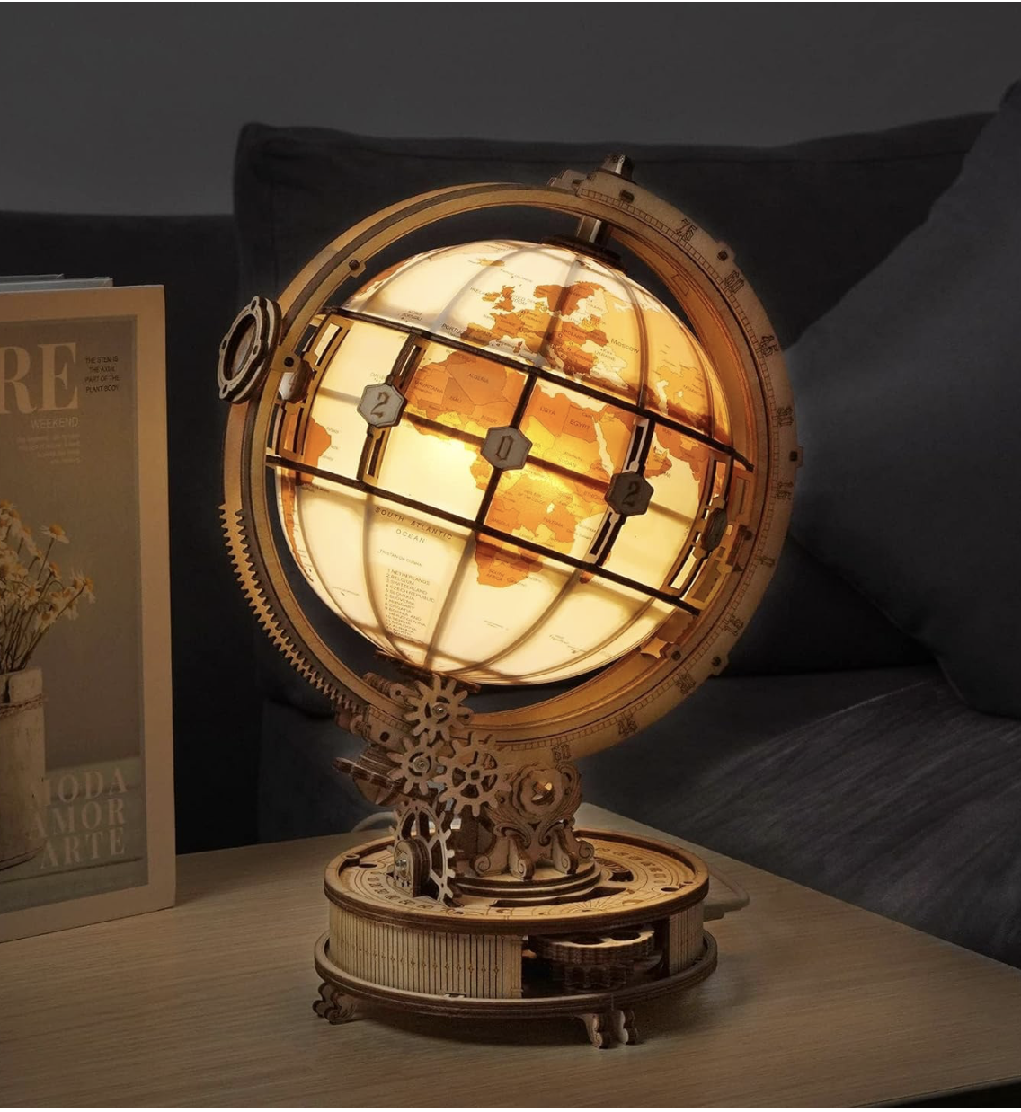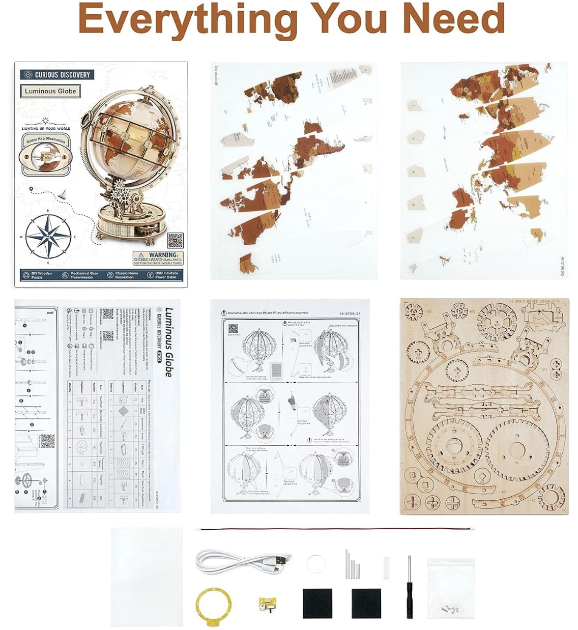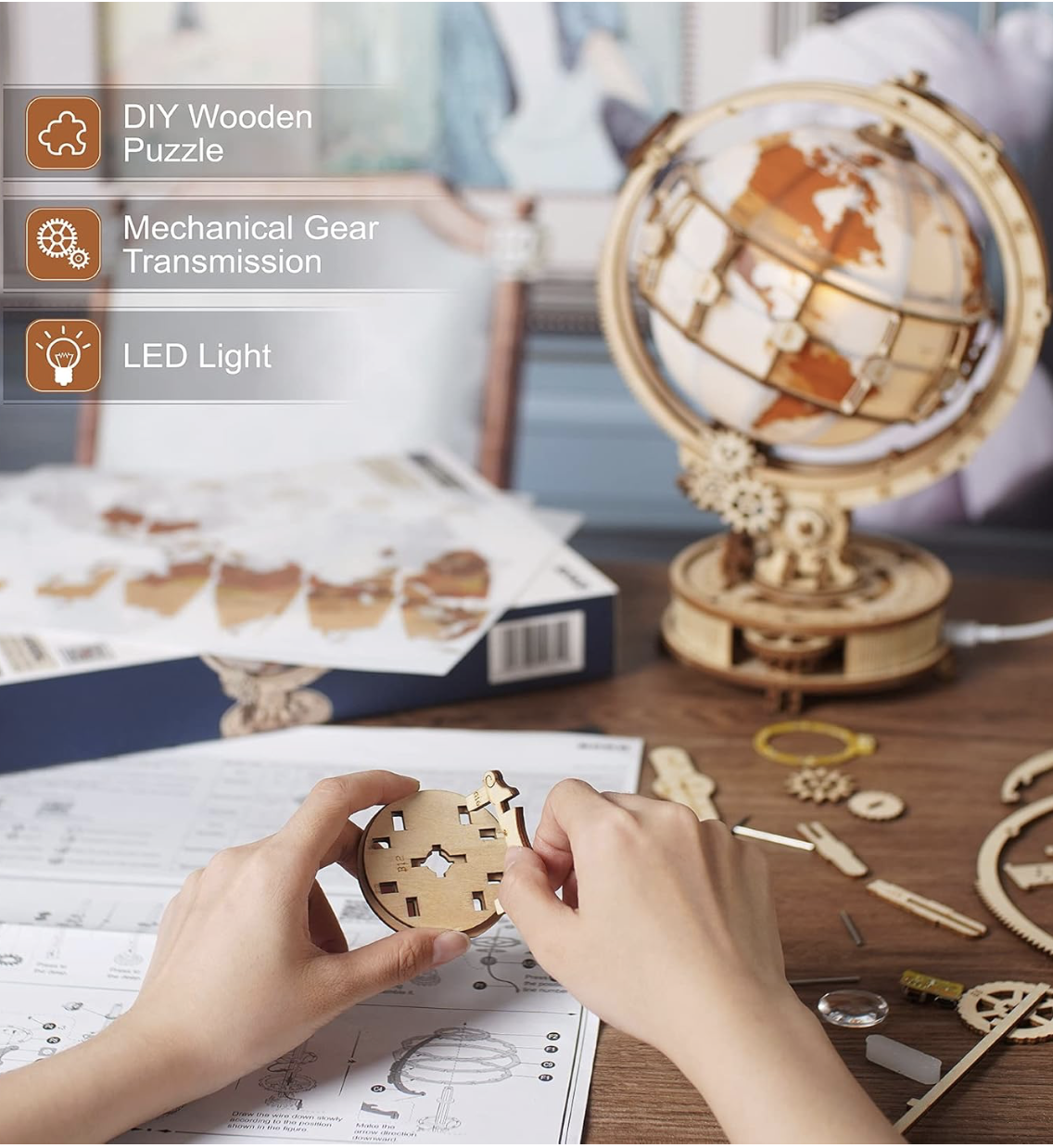 This captivating luminous globe is a retro-style 3D Wooden puzzle with a built-in LED light. It combines a 3D wooden globe model with a practical night lamp. Very special handcraft kit for Mom and Dad to assemble together. Once assembled, it bathes any room in a mesmerizing glow, adding a touch of charm and warmth. Treat your loved ones or yourself to this unique and enchanting experience!