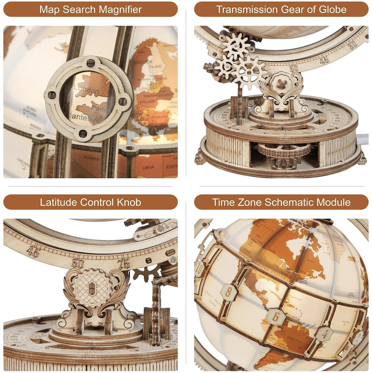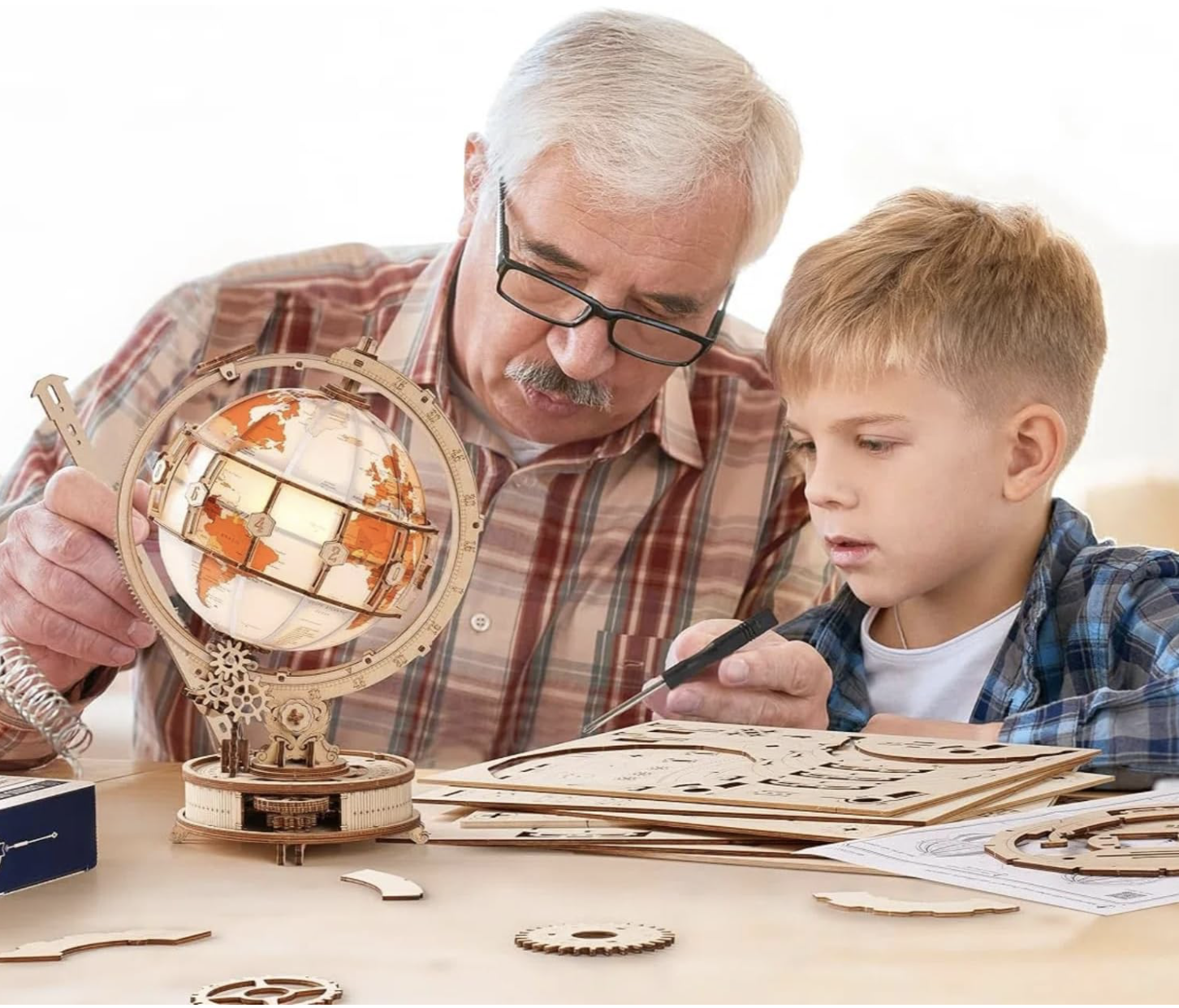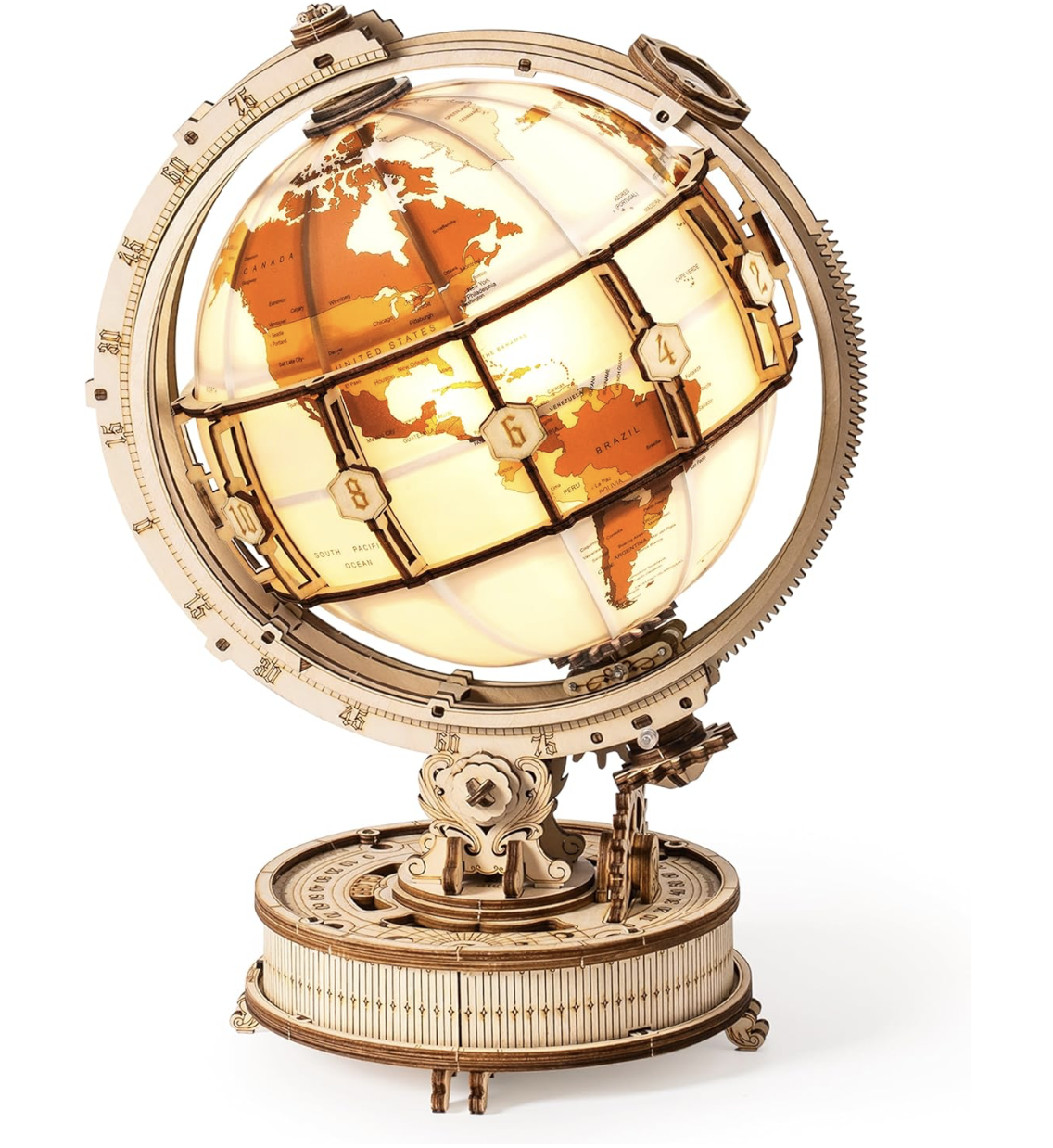 This captivating luminous globe is a retro-style 3D Wooden puzzle with a built-in LED light. It combines a 3D wooden globe model with a practical night lamp. Very special handcraft kit for Mom and Dad to assemble together. Once assembled, it bathes any room in a mesmerizing glow, adding a touch of charm and warmth. Treat your loved ones or yourself to this unique and enchanting experience!