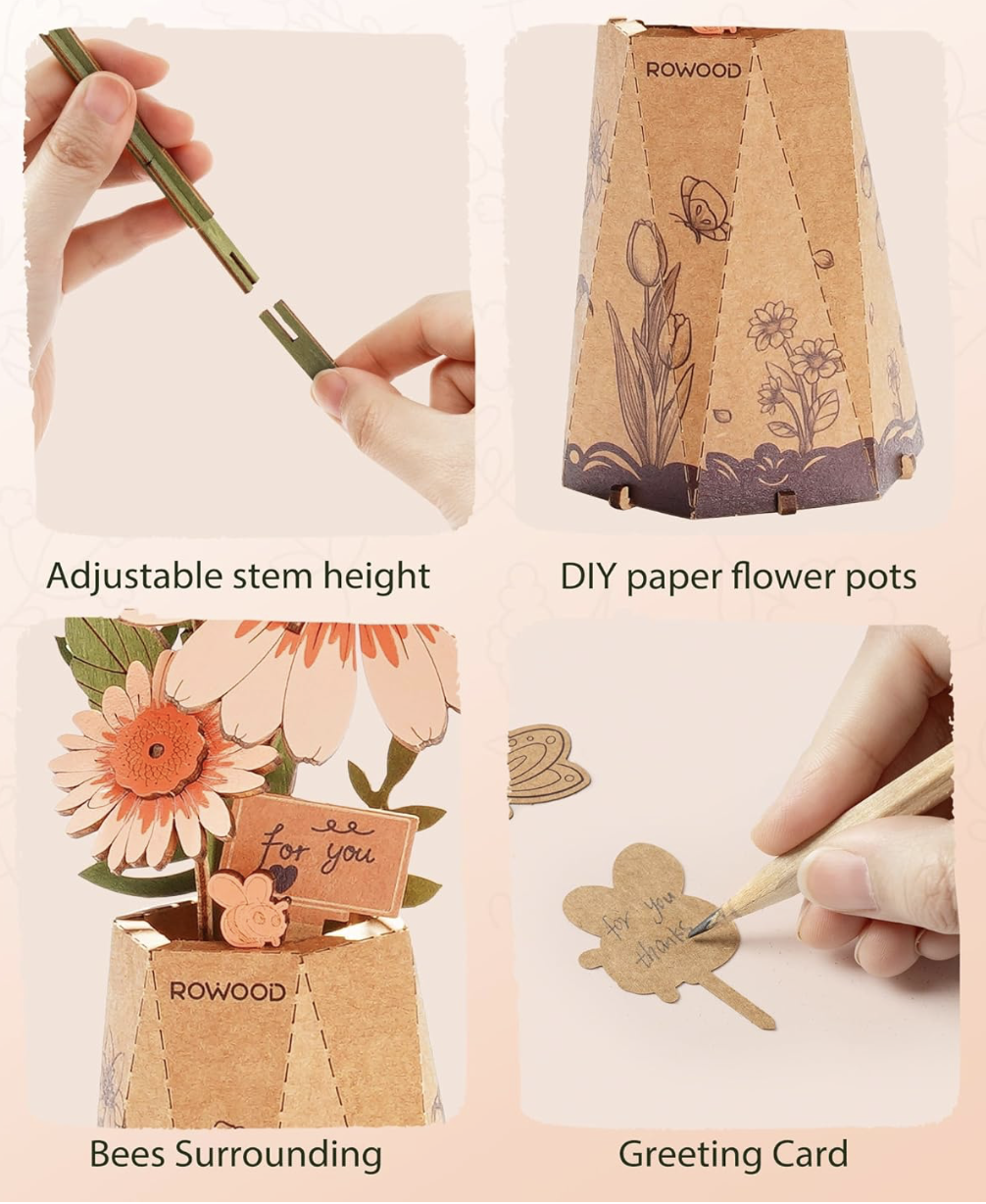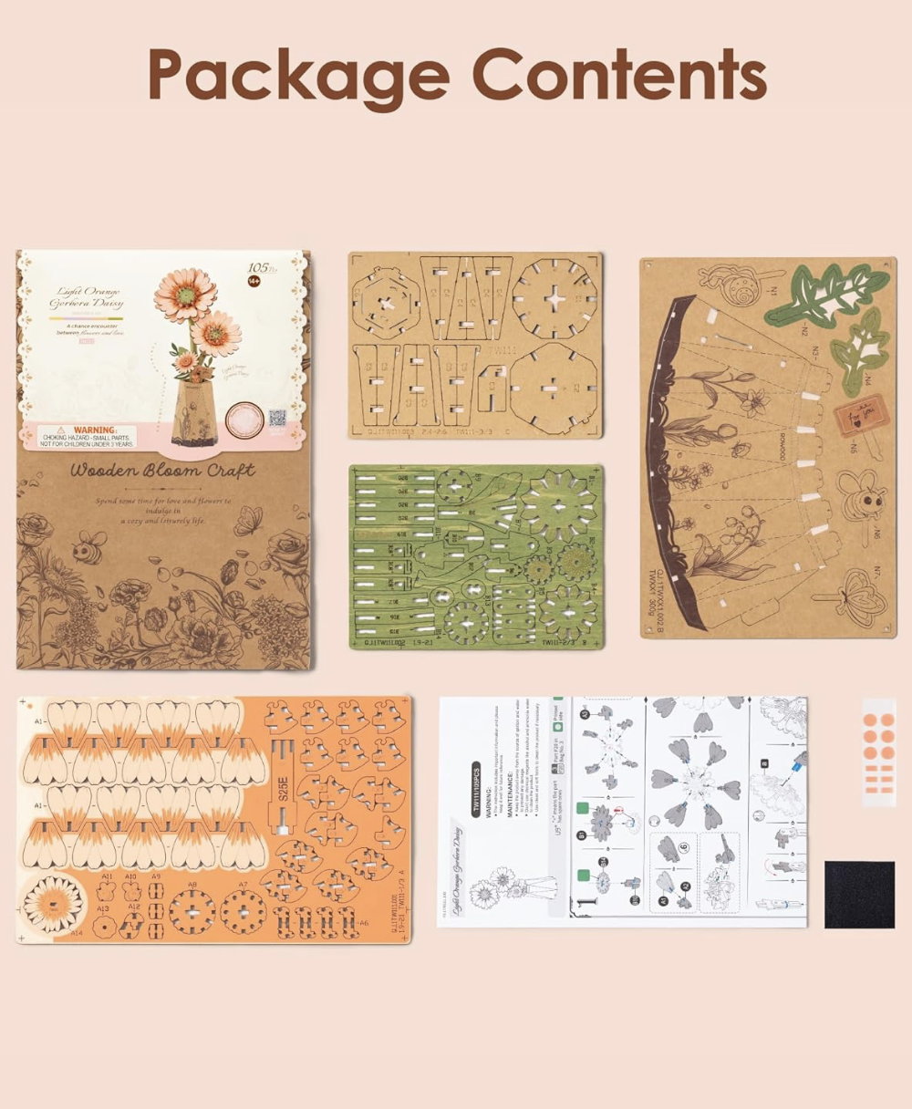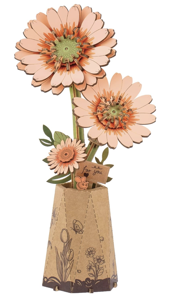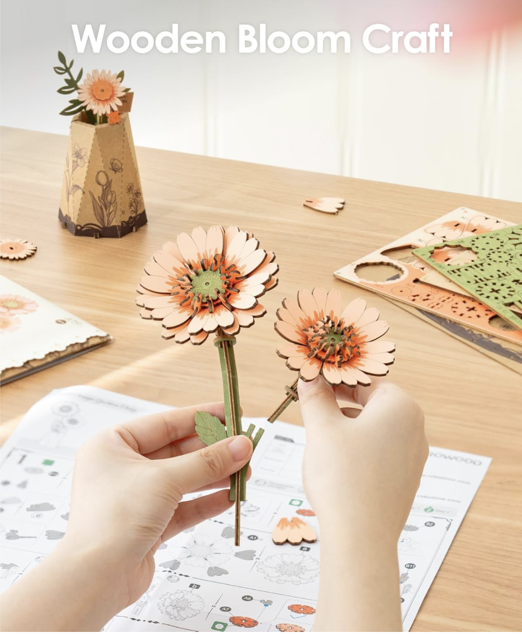 Enhance your living space with the timeless charm of wooden flowers building set. Display them individually in the included cardboard base or arrange them in your favorite vase for a stunning centerpiece. Add a touch of elegance to any room with these exquisite floral creations.