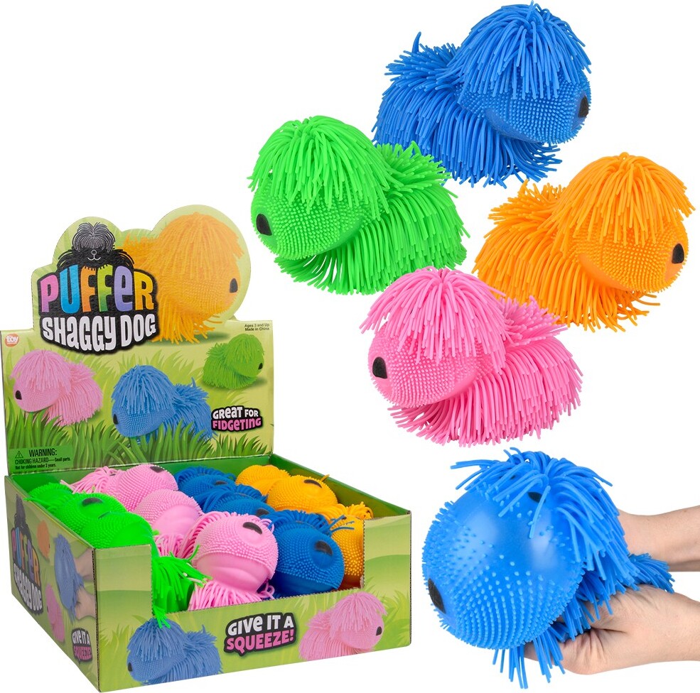 These 7″ shaggy dog-shaped puffers are great for squeezing purposes. Assorted colors.