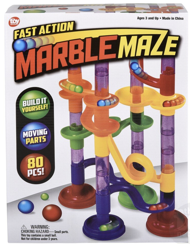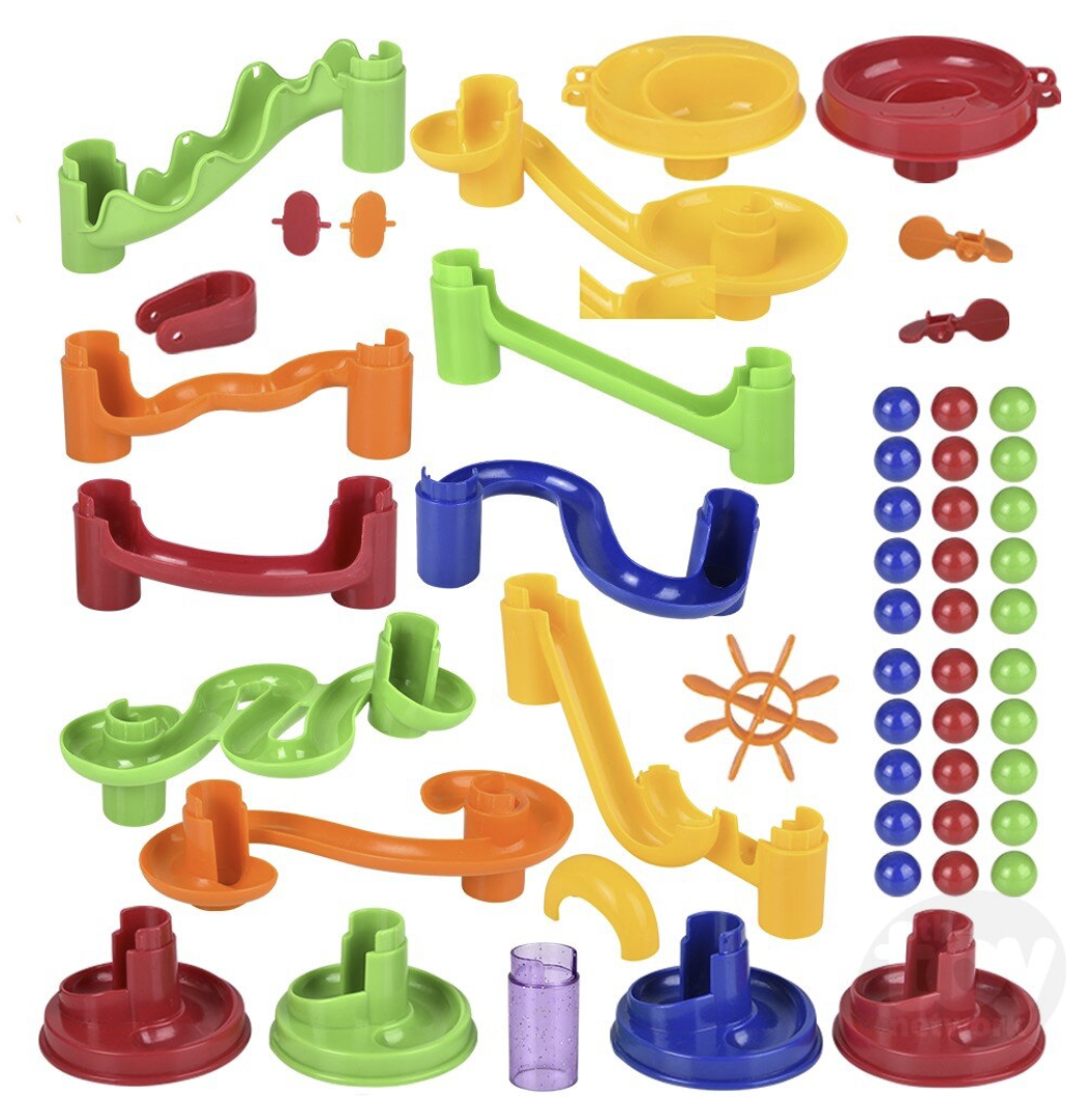 Our 80 Piece Marble Run lets users create unique structures to roll marbles down for endless creative fun. Includes 30 marbles and 80 building pieces.