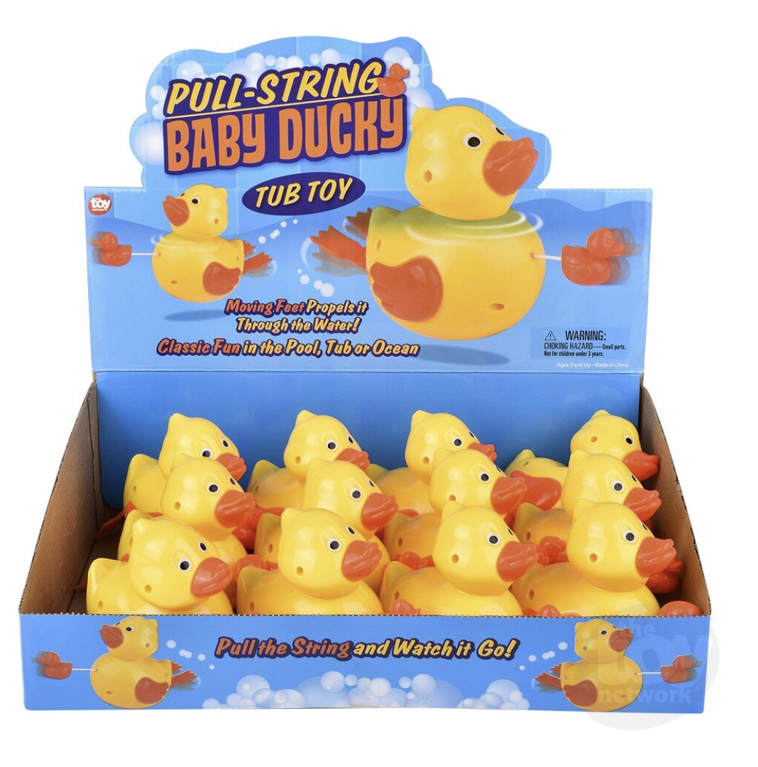 Our 6″ Pull-String Ducky Bath Toys are perfect for baths and pools. Simply pull the string back and watch the ducky swim through the water!