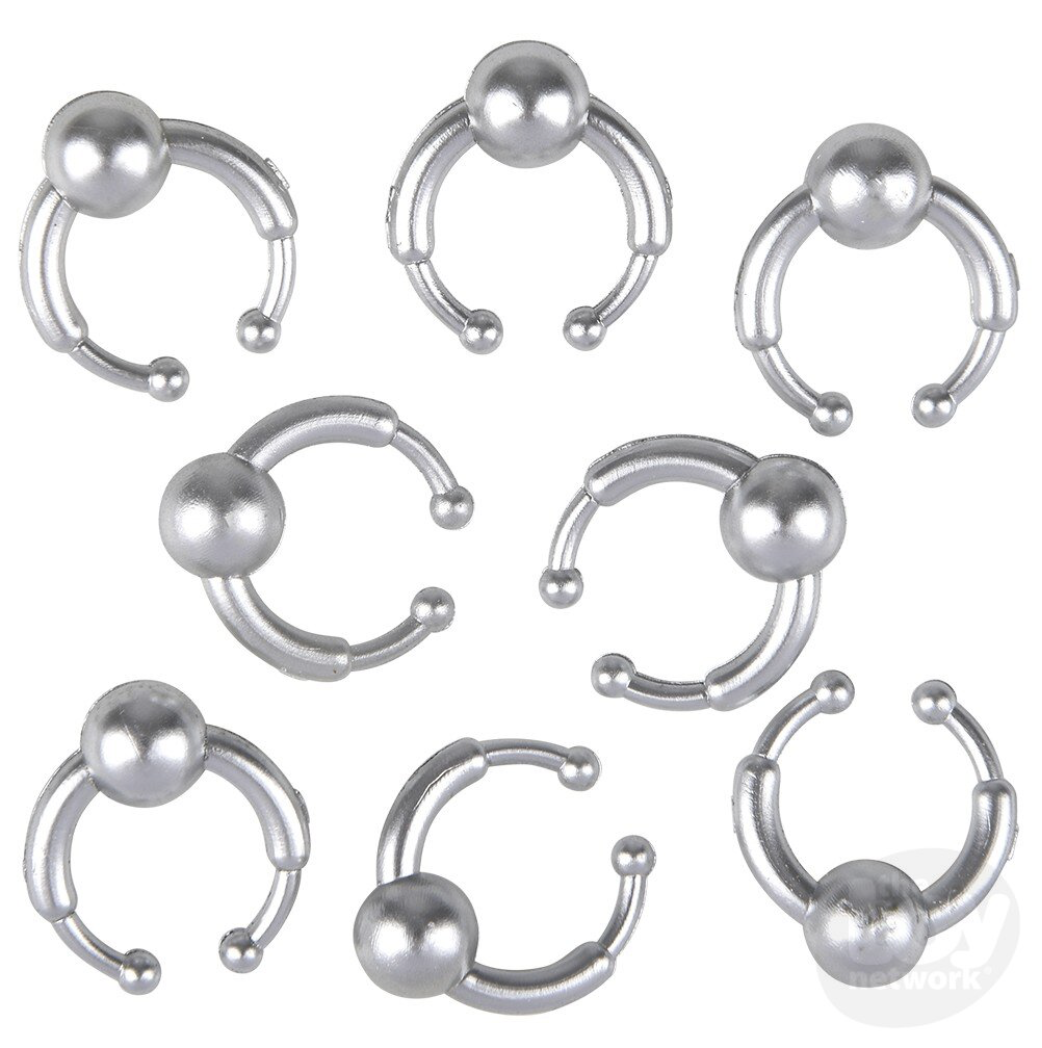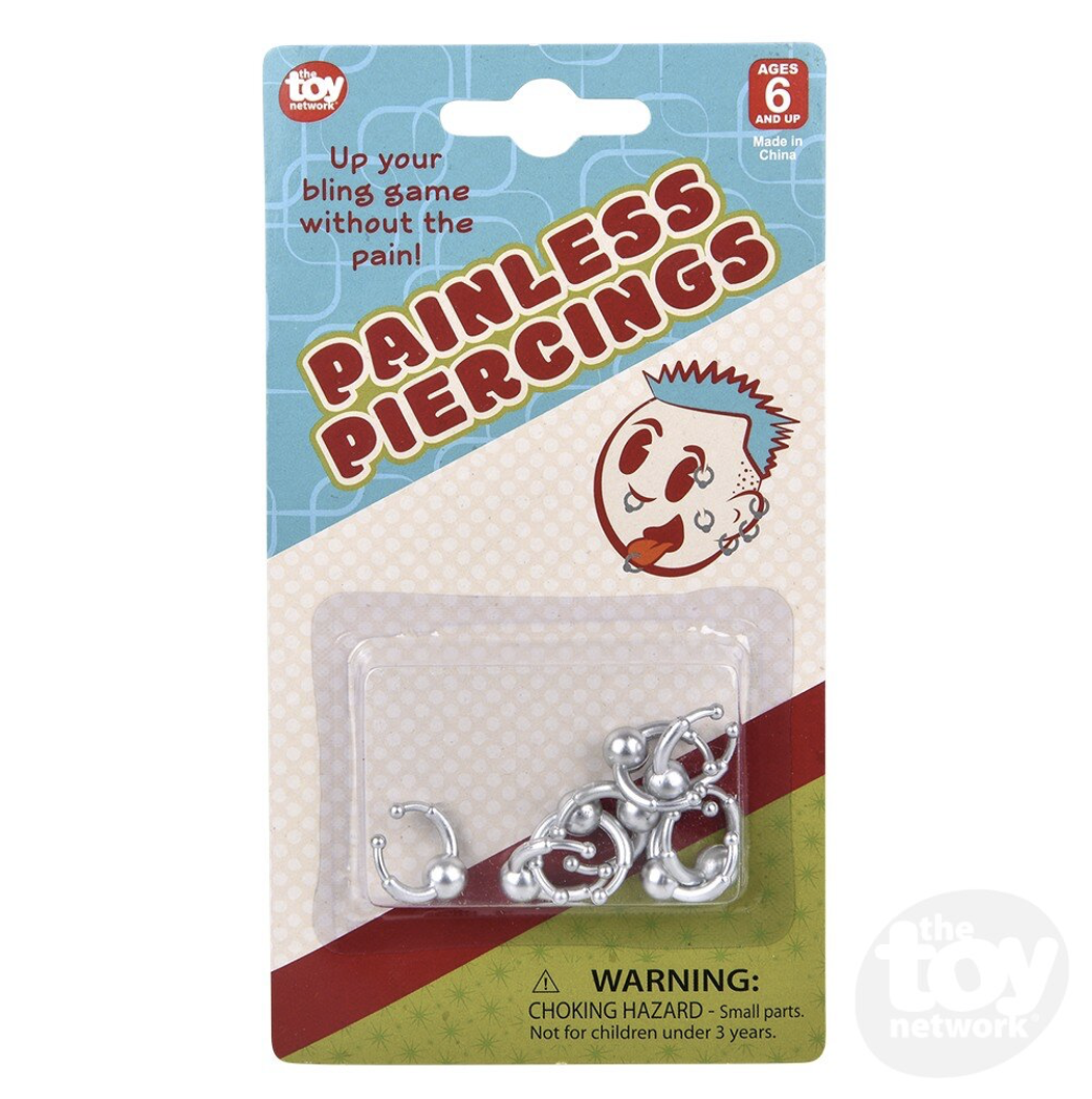 Up your bling game without the pain! Our Painless Piercings are great for making people believe you’ve gotten a whole bunch of new piercings when you haven’t! Pinch the ends together and squeeze whatever body part you want “pierced” into place. 8 pieces on a blister card.